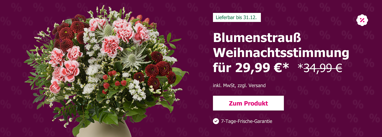 Der Standardversand innerhalb Deutschlands kostet 6,99 €. Zugestellt wird Dein Blumengruß zwischen Montag bis Samstag, 8-19 Uhr. Ebenso hast Du die Möglichkeit, einen Wunschtermin anzugeben, der in 95 Prozent der Fälle erreicht wird. Andernfalls verzögert sich der Blumenversand gegebenenfalls um einen Werktag. Sollte der Empfänger nicht anzutreffen sein, wird die Sendung beim Nachbarn abgegeben. Alternativ kannst Du dich auch für die garantierte Zustellung entscheiden, welche 12,99 € kostet – hier profitierst Du zusätzlich von einer Geld-zurück-Garantie, wenn Du termintreu Blumen verschicken möchtest. Wenn der Wunschtermin nicht eingehalten wird, kannst Du zwischen einer Ersatzlieferung oder einer Rückerstattung wählen. Gerne bieten wir Dir auch die Lieferung in andere Länder an. Hier wird für Österreich, Dänemark und Polen 11,99 € Versand erhoben, für Belgien, Frankreich, Luxemburg, Niederlande, Schweden, Slowenien und Tschechien kostet der Versand 14,99 €. Die Zustellung erfolgt hier Mittwoch bis Freitag zwischen 8-19 Uhr. Alternativ bieten wir Dir zudem unsere Floristenzustellung innerhalb Deutschlands an, bei der Dein Strauß von einem Floristen in der Nähe versendet. Hierfür beträgt der Versand 14,99 €.