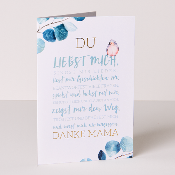 Sie erhalten eine wunderschöne Grußkarte mit der Aufschrift „Du liebst mich, singst mir Lieder, liest mir Geschichten vor, beantwortest viele Fragen, spielst und lachst mit mir, ermutigst mich und glaubst an mich, zeigst mir den Weg, tröstest und behütest mich und wirst mich nie vergessen. Danke Mama“