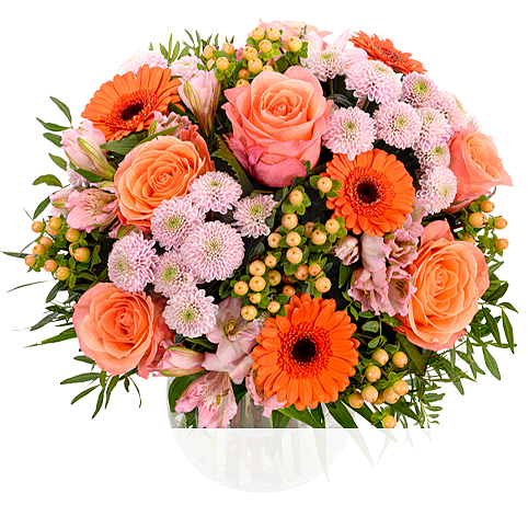 Dekorativer Blumengruß in harmonischer Farbkombination mit Blumen wie z. B. Rosen und Santini, von Hand floristisch mit Schnittgrün rund gebunden.