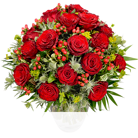 Charmanter Rosenstrauß mit roten Rosen, von Hand floristisch mit Schnittgrün rund gebunden.