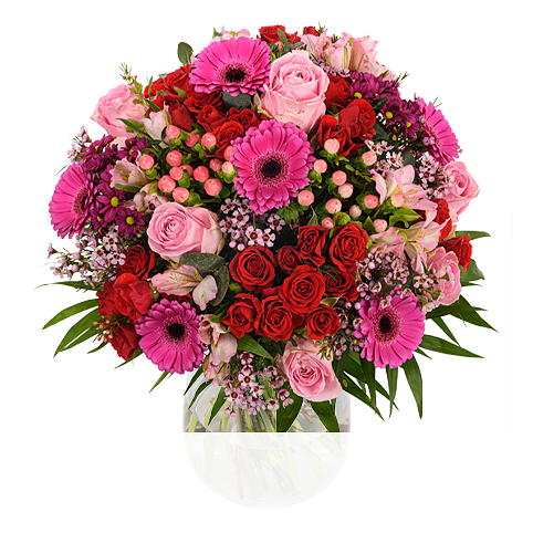 Herrlich bunter Blumenstrauß mit Rosen, Gerbera und anderen saisonalen Blumen in Rot, Rosa und Pink, von Hand floristisch mit Schnittgrün rund gebunden.