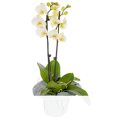 Wundervoller Blumengruß mit exotischen Orchideen in einem dekorativen Topf.