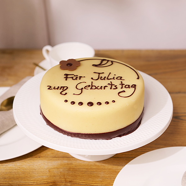 2-zeilig personalisierbar mit dunkler Schrift (14 Zeichen/Zeile), ob mit Namen, Anlass oder Gruß - mit einem individuellen Schriftzug wird diese Torte noch persönlicher!
