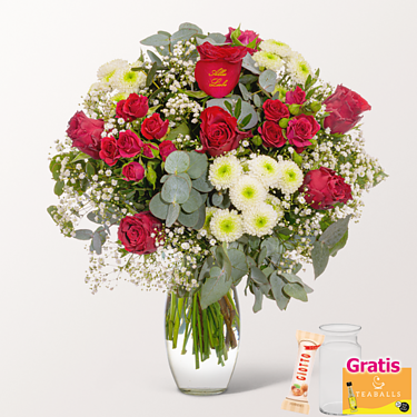 Premiumstrauß Liebestraum mit Premiumvase & Ferrero Giotto 3er & Teaballs