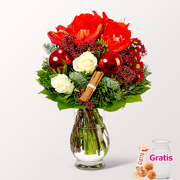 Wunderschöner Blumenstrauß mit roter Amaryllis, Zimtstange, weißen Rosen, roter Skimmie, roter Santini, roter Weihnachtskugel, Nobilisgrün, Pistochia und Salal. Durchmesser ca. 30 cm. Frisch für Dich zusammengestellt, mit Pflegetipps, Blumennahrung und Wasser versorgt.
