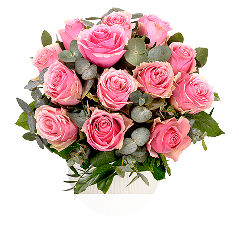 Romantischer Rosenstrauß mit rosa Rosen, von Hand floristisch mit Schnittgrün rund gebunden.