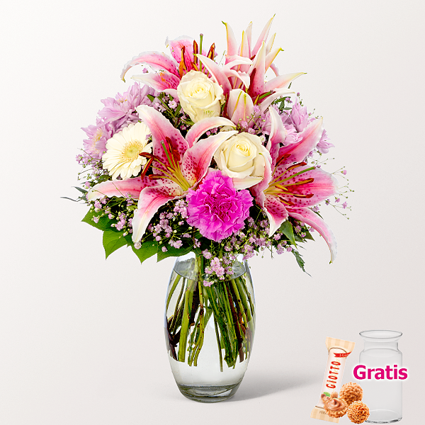 Hinweis: Die Lilie des Straußes kommt im frischen und unaufgeblühten Zustand. Sie öffnet sich später als die anderen Blumen, je nach Standort und Temperatur. Dann bereitet der Strauß viel länger Freude.