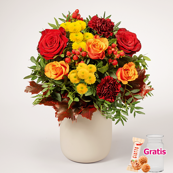 Imponierender Blumenstrauß mit orangen Rosen, roten Premiumrosen, dunkelroten Nelken, roten Hypericum, rotem Eichenlaub, orangen Santinibällen, Lederfarn und Pistochia. Durchmesser ca. 30 cm. Frisch für Dich zusammengestellt, mit Pflegetipps, Blumennahrung und Wasser versorgt.