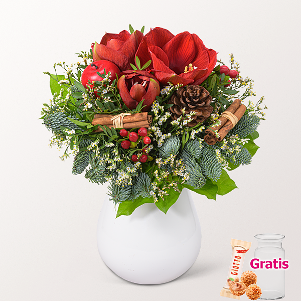 Herrlicher Blumenstrauß mit roter Amaryllis, roten Hypericum, weißem Limonium, Zapfen, rotem Apfel, Zimtbündchen, Nobilis, Pistochia und Salal. Durchmesser ca. 30 cm. Frisch für Dich zusammengestellt, mit Pflegetipps, Blumennahrung und Wasser versorgt.