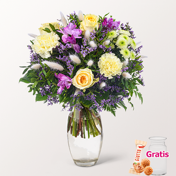 Bezaubernder Blumenstrauß mit cremefarbenen Rosen Buttercup, pinken Freesien, fliederfarbenem Limonium, hellgelben Nelken, cremefarbenem Santiniball, Pistazie, gebleichten Lagurus, Lederfarn und Salal. Durchmesser ca. 40 cm. Frisch für Dich zusammengestellt, mit Pflegetipps, Blumennahrung und mit Wasser versorgt.