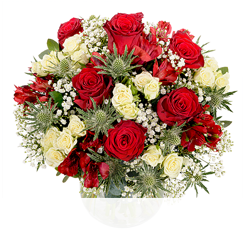 Romantischer Blumenstrauß mit Rosen in Rot und Weiß und saisonalen Beiwerk, von Hand floristisch mit Schnittgrün rund gebunden.