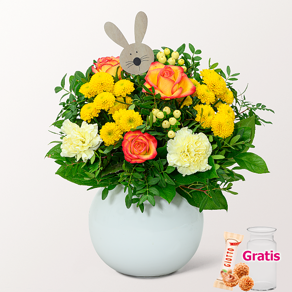 Hübscher Osterstrauß mit orange-gelben Rosen Outlaw, hellgelben Nelken, cremefarbenem Hypericum, gelben Santiniballs, 1 Hasenstecker, Pistochia und Salal. Durchmesser ca. 30 cm. Frisch für Dich zusammengestellt, Blumennahrung und mit Wasser versorgt.