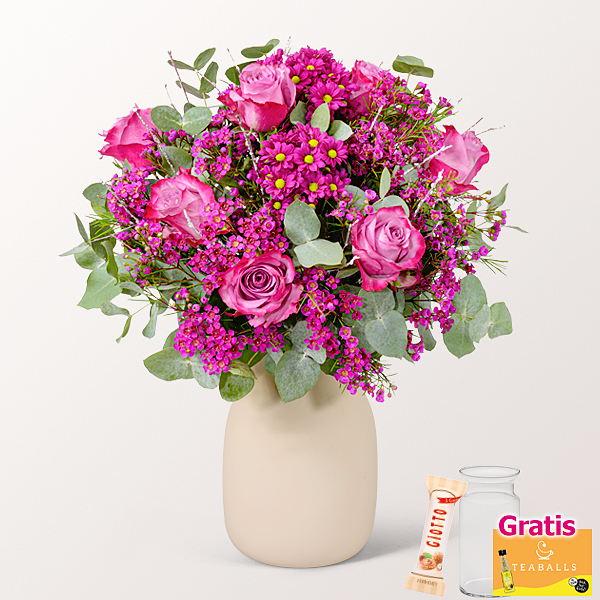 Moderner Blumenstrauß mit lilafarbene Rosen, pinken Santini, pinken Wachsblumen, Eukalyptus und weißen Birkenzweigen. Durchmesser ca. 35 cm. Frisch für Dich zusammengestellt, mit Pflegetipps, Blumennahrung und Wasser versorgt.