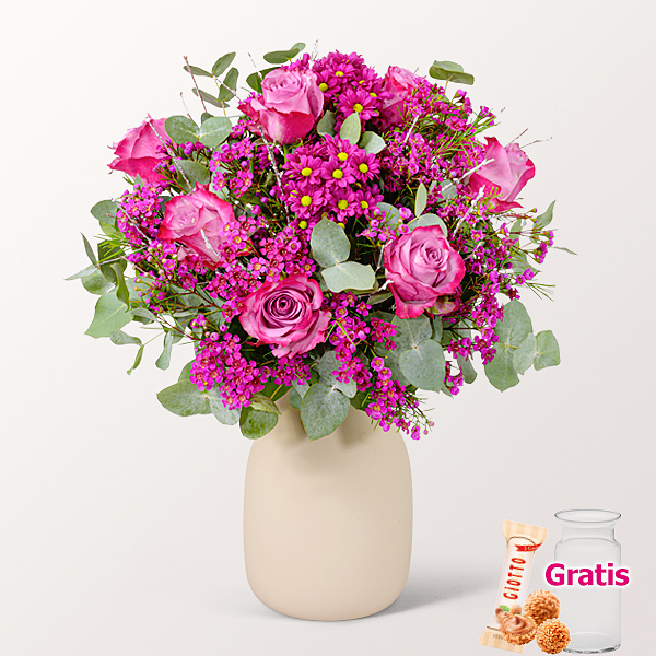 Moderner Blumenstrauß mit lilafarbene Rosen, pinken Santini, pinken Wachsblumen, Eukalyptus und weißen Birkenzweigen. Durchmesser ca. 35 cm. Frisch für Dich zusammengestellt, mit Pflegetipps, Blumennahrung und Wasser versorgt.