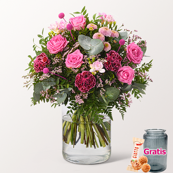 Moderner Premiumstrauß mit rosa Rosen, rosa Freesien, pinken Trommelschlägeln, Nelken St. Nob. Burgundy, rosa Limonium, rosa Santiniball, Eukalyptus, Lederfarn und Pistochia. Durchmesser ca. 45 cm. Frisch für Dich zusammengestellt, mit Pflegetipps, Blumennahrung und Wasser versorgt.Hinweis: Die Freesien des Straußes kommen im frischen und unaufgeblühten Zustand. Sie öffnen sich später als die anderen Blumen, je nach Standort und Temperatur. Dann bereitet der Strauß viel länger Freude.