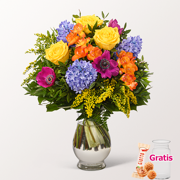 Umwerfender Blumenstrauß mit gelben Rosen, orange-roten Freesien, blauen Hyazinthen, Solidago, pinken Anemonen, Lederfarn, Pistochia und Salal. Durchmesser ca. 25 cm. Frisch für Dich zusammengestellt, mit Pflegetipps, Blumennahrung und mit Wasser versorgt.