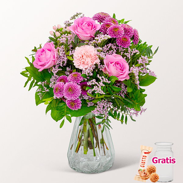 Märchenhafter Blumenstrauß mit rosa Rosen, pinken Sedum, pinkem Santiniball, rosa Limonium, rosa Nelke, rosa Hypericum, Pistochia und Salal. Durchmesser ca. 30 cm. Frisch für Dich zusammengestellt, mit Pflegetipps, Blumennahrung und Wasser versorgt.