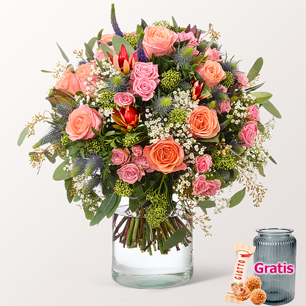 Wunderschöner Premiumstrauß mit lachsfarbenen Rosen Lady Margaret, rosa Sprayrosen, weißem Schleierkraut, blauen Disteln, weißen Skimmie, roten Leucadendron, blauen Veronika, Eukalyptus und Pistochia. Durchmesser ca. 45 cm. Frisch für Dich zusammengestellt, mit Pflegetipps, Blumennahrung und Wasser versorgt.