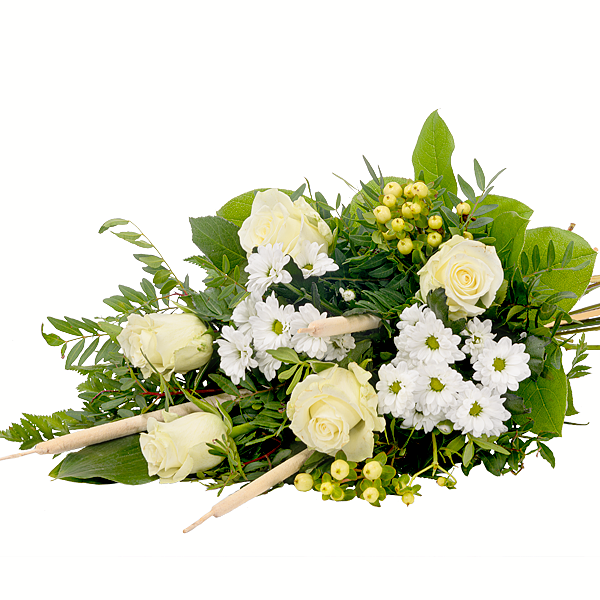Eleganter Blumengruß mit weißen Rosen „Magadi“, weißen Santini, cremefarbenem Hypericum, gebleichten Rohrkolben, Aspidistra, Lederfarn, Pistochia und Salal. Die Größe beträgt ca. 60 x 40 cm. Dazu erhältst Du einen Beutel Blumennahrung und eine Pflegeanleitung.