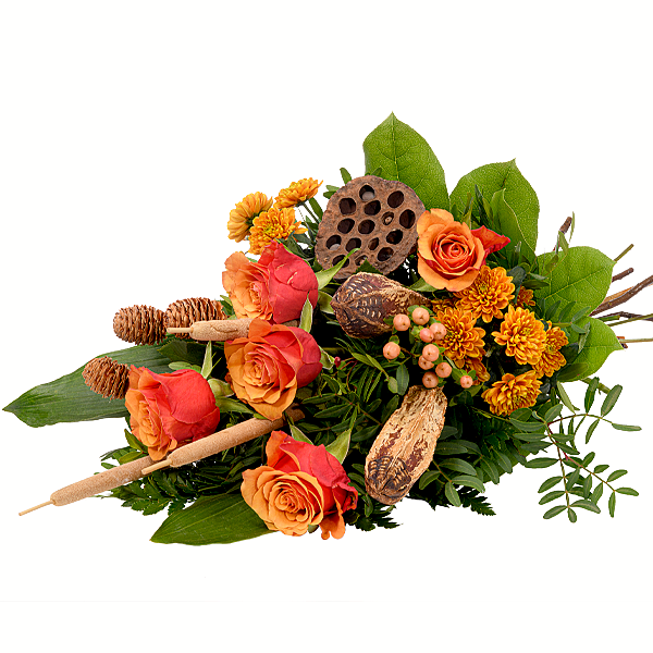 Hübscher Blumengruß mit orangen Rosen, orangem Hypericum, orangen Santiniballs, naturfarbenen Rohrkolben, naturfarbenen Mehogany, Sabulosum, Lotus, Aspidistra, Lederfarn, Pistochia und kleinen Salal. Die Größe beträgt ca. 60 x 40 cm. Dazu erhältst Du einen Beutel Blumennahrung und eine Pflegeanleitung.