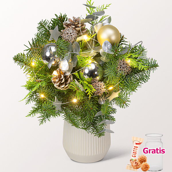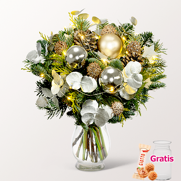 Langhaltender Winterstrauß mit silberfarbenen glänzenden Weihnachtskugeln (6 cm), matt goldfarbener Weihnachtskugel (6 cm), silberfarbenem Eukalyptus, Micro-Lichterkette (inkl. Batterien), silberfarbenen Holzsternen (4 cm), gekälkten Pinus Nigra, Amberbaumfrüchten und winterlichem Grün. Durchmesser ca. 25-30 cm.