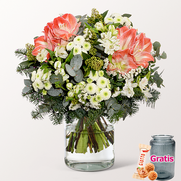 Hinweis: Die Amaryllis des Straußes kommen im frischen und unaufgeblühten Zustand. Sie öffnen sich später als die anderen Blumen, je nach Standort und Temperatur. Dann bereitet der Strauß viel länger Freude.