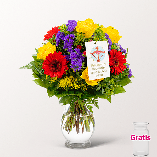 Frischer Blumenstrauß mit gelben Rosen, roten Germini, blauer Statice, Solidago, rotem Hypericum, Bupleurum, Lederfarn, Pistochia und Salal. Dazu binden wir einen Sternzeichen-Blumenstecker ein. Durchmesser ca. 30 cm. Frisch für Dich gebunden mit Pflegetipps, Blumennahrung und mit Wasser versorgt.