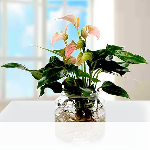 Exotische Anthurie Jolie Peach als Water Plant in einer Glasvase (ca. 20 x 19 cm). Unsere Anthurie steht im Wasser und ist ein absolut originelles Dekorationselement, denn Zimmerpflanzen im Wasser sind der Wohntrend schlechthin. Eine solche Hydrokultur sieht nicht nur toll aus, sondern lässt die Wurzeln der Anthurie auch besser atmen, wodurch die Pflanze pflegeleicht in Wohnräumen zu halten ist. Wer Spaß an Blumen und Zimmerpflanzen in tollen Vasen hat, wird diese Waterplant lieben. Die Pflanze ist mit Glas ca. 40 cm hoch.Hinweis: Glasgefäß kann von Abbildung abweichen.Die Pflanze ist leicht giftig.Hersteller:FloraPrima GmbHDidderser Str. 2838176 Wendeburginfo@floraprima.de