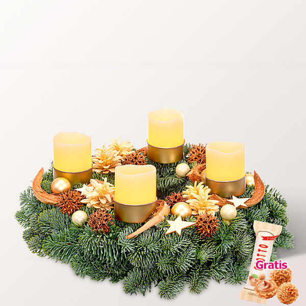 Harmonischer Adventskranz mit einem Römerkranz von 30 cm Durchmesser, cremefarbenen LED-Kerzen (6,5 x 5 cm), goldfarbenen Kerzentüllen, Net Petal, gebleichten Pinus Sylvestris, Amberbaumfrüchten, matt goldfarbenen Weihnachtskugeln (2,5 cm), cremefarbenen glänzenden Weihnachtskugeln (2 cm) und Holzsternen (3 cm).