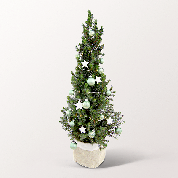 Ein klassisches Bäumchen mit hübscher Dekoration: offene Holzsterne in Weiß und Weihnachtskugeln (3-4 cm) in den Farben matt und glänzend Jade. Ergänzt wird dies durch einen modernen Jutesack mit cremefarbenem Rand. Die Lichterkette mit 40 Lichtern sorgt für eine stimmungsvolle Atmosphäre in der Adventszeit. Die Lichterkette ist mit Timerfunktion. Das Bäumchen kann nach der Weihnachtszeit ausgepflanzt werden.Hinweis: Du erhältst den Baum ungeschmückt. So kommst Du in den Genuss des Baumschmückens mit Deinen Liebsten.Hersteller:FloraPrima GmbHDidderser Str. 2838176 Wendeburginfo@floraprima.de