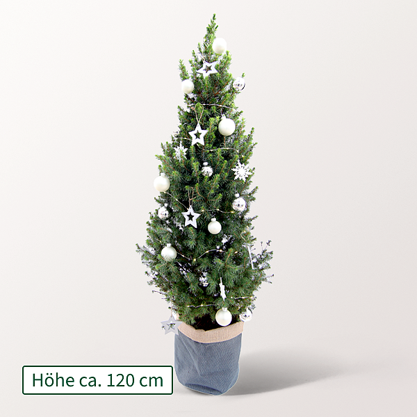 Dieses Weihnachtsbäumchen (ca. 120 cm) leuchtet regelrecht: offene Holzsterne in Silber in Verbindung mit weißen Schneeflocken machen dieses Bäumchen schon zu etwas Besonderem. Aber zusammen mit den Weihnachtskugeln (4-5 cm) in der Farbe matt und glänzend Silber wirkt dieses Bäumchen sehr wie ein Lichtertraum. Das stimmungsvolle Licht der 100er Lichterkette betont dies zusätzlich. Farblich abgestimmt gibt es einen grauen Jutesack mit Rand. Ein Highlight der Weihnachtsdekoration. Die Lichterkette ist mit Timerfunktion. Das Bäumchen kann nach der Weihnachtszeit ausgepflanzt werden.Hinweis: Du erhältst den Baum ungeschmückt. So kommst Du in den Genuss des Baumschmückens mit Deinen Liebsten.Hersteller:FloraPrima GmbHDidderser Str. 2838176 Wendeburginfo@floraprima.de