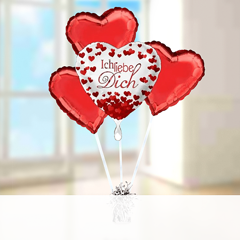 Drei Worte mit so einer großen Bedeutung! Zeige Deinem Lieblingsmenschen, wie wichtig sie/er ist mit den schönsten drei Worten: Ich liebe Dich!Diese Ballons versprühen definitiv Liebe. Zeige Deine Wertschätzung und bereite eine Freude. Der Motivballon ist mit den Worten „Ich liebe dich“ und vielen kleinen roten Herzchen bedruckt. Er wird ergänzt mit drei klassischen roten Herzballons. Die Ballons sind bereits mit Helium gefüllt und werden sicher verpackt an die Wunschadresse geliefert.Inhalt: 1x Folienballon „Ich liebe dich“, 3x Herzballon Rot (jeweils Helium-gefüllt)Farbe: Rot, WeißGröße: ca. 45 cm pro BallonSchwebedauer: mindestens 7 Tage, mit Strohhalmtrick (Nachfüllen mit Luft) meistens sogar mehrere WochenServicehinweis: Beim Öffnen des Pakets schweben die Ballons heraus, fliegen aber nicht davon. Heliumgefüllte Ballons können sich bei Kälte zusammenziehen und dadurch im ersten Moment möglicherweise nicht mehr ganz prall aussehen. Bei Zimmertemperatur entfalten sie sich wieder nach kurzer Zeit und schweben schön und prall.