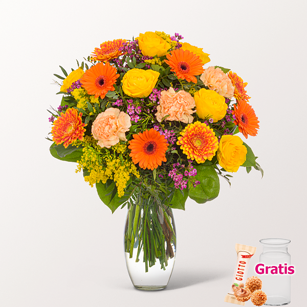 Strahlender Blumenstrauß mit gelben Rosen, orangen Germini, pinken Wachsblumen, gelb-orangen Germini, orangen Nelken, Solidago, Pistochia und Salal. Durchmesser ca. 40 cm. Frisch für Dich zusammengestellt, mit Pflegetipps, Blumennahrung und mit Wasser versorgt.