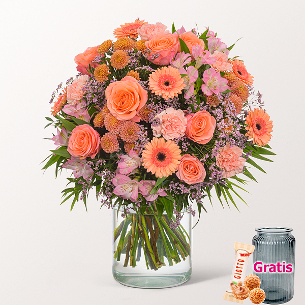 Auserlesener Premiumstrauß mit lachsfarbenen Rosen Lady Margaret, lachsfarbenen Nelken, lachsfarbenen Santiniballs Ellison Salmon, lachsfarbenen Germini, rosa Limonium, rosa Alstromerie, Chico Jumbo und Pistochia. Durchmesser ca. 50 cm. Frisch für Dich zusammengestellt, mit Pflegetipps, Blumennahrung und Wasser versorgt.