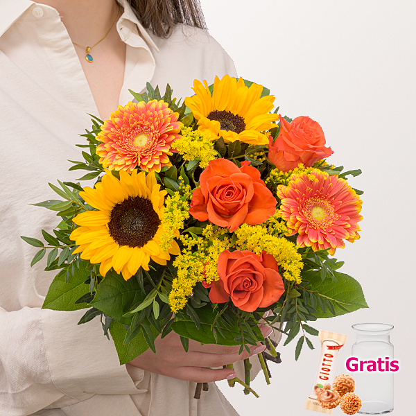 Frühlingshafter Blumenstrauß mit orangen Rosen, Sonnenblumen, Solidago, gelb-orangen Germini, Pistochia und Salal. Durchmesser ca. 25 cm. Frisch für Dich zusammengestellt, mit Pflegetipps, Blumennahrung und mit Wasser versorgt.