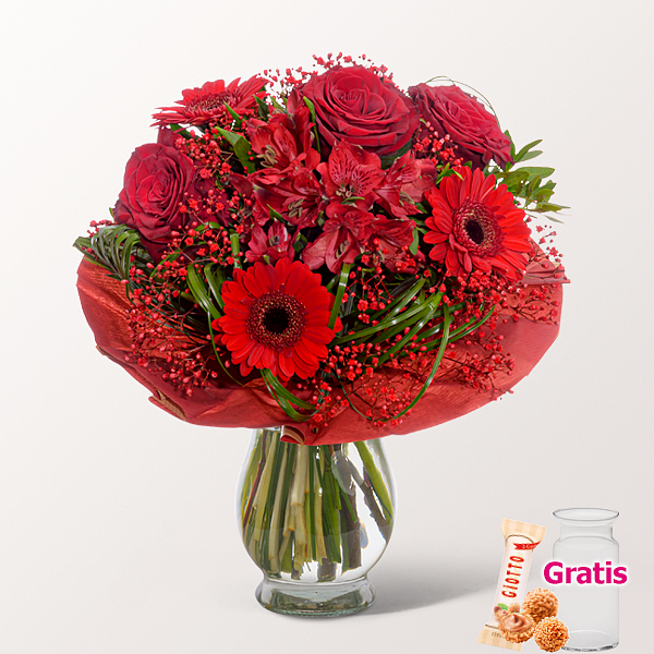 Einzigartiger Valentinstagsstrauß mit roten Rosen Monte Carlo, roter Alstromeria, roten Germini, rotem Schleierkraut, Gräsern und Pistochia in einer roten Manschette. Durchmesser ca. 30 cm. Frisch für Dich zusammengestellt, mit Pflegetipps, Blumennahrung und Wasser versorgt.