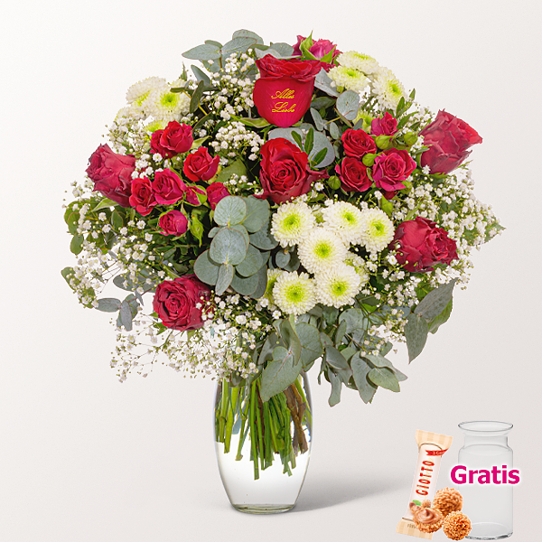 Umwerfender Blumenstrauß mit roter Rose mit Golddruck „Alles Liebe“, roten Rosen, roten Sprayrosen, weißem Schleierkraut, weißen Santiniballs, Eukalyptus und Pistochia. Durchmesser ca. 40 cm. Frisch für Dich zusammengestellt, mit Pflegetipps, Blumennahrung und Wasser versorgt.