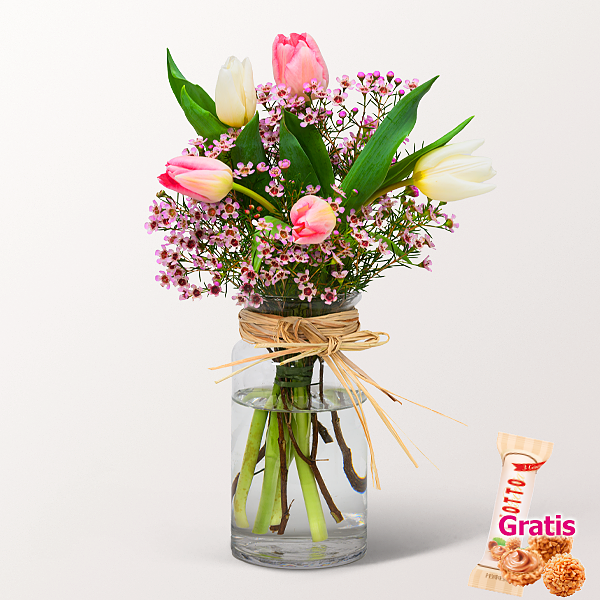 Märchenhaftes Arrangement mit rosa Tulpen, weißen Tulpen und rosa Wachsblumen in einem modernen Glas (ca. 20 x 13 cm) dekoriert mit einer Bastschleife. Frisch für Dich zusammengestellt, mit Pflegetipps, Blumennahrung und Wasser versorgt.