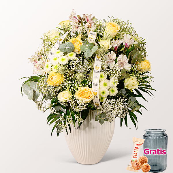Liebevoller Premiumstrauß mit weißen und cremefarbenen Rosen, weißen Schleierkraut, weißen Alstromerie, weißen Santiniballs, weißen Disteln, großer Schleife, Eukalyptus, Chico Jumbo und Pistochia. Durchmesser ca. 50 cm. Frisch für Dich zusammengestellt, mit Pflegetipps, Blumennahrung und Wasser versorgt.