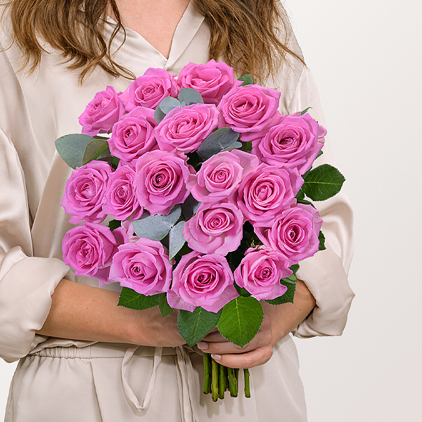Hübsches Rosenpräsent mit 18 rosa Rosen umspielt von Eukalyptus. Die Rosen sind ca. 40 cm lang und haben eine Kopfgröße von ca. 3,5 cm. Frisch für Dich zusammengestellt, mit Pflegetipps, Blumennahrung und Wasser versorgt.