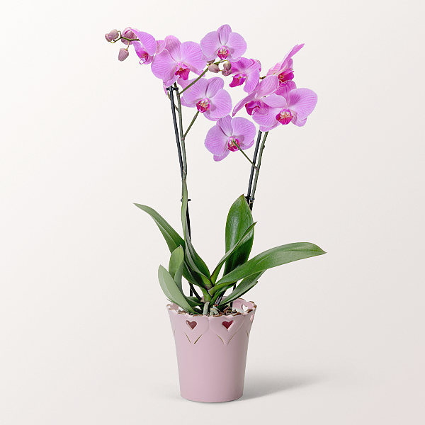 Wunderschöne Orchidee in Rosa in einem wunderschönen Keramiktopf mit Herzmuster. Größe ca. 60 cm. Mit ausführlicher Pflegeanleitung.Hersteller:FloraPrima GmbHDidderser Str. 2838176 Wendeburginfo@floraprima.de