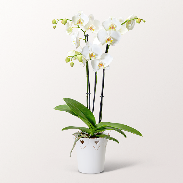 Exotische Orchidee in Weiß in einem wunderschönen Keramiktopf mit Herzmuster. Größe ca. 60 cm. Mit ausführlicher Pflegeanleitung.