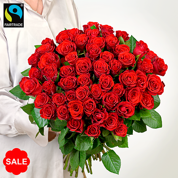 Romantisches Rosenpräsent mit 50 roten Rosen. Die Rosen sind ca. 40 cm lang und haben eine Kopfgröße von ca. 3,5 cm. Frisch für Dich gebunden mit Pflegetipps, Blumennahrung und mit Wasser versorgt.Mit dem Kauf dieser Fairtrade Rosen leisten Sie einen Beitrag zu besseren Arbeits- und Lebensbedingungen für Angestellte auf Rosenfarmen. Durch den Fairen Handel und die Fairtrade-Prämie können diese in eine nachhaltigere Zukunft investieren. Mehr Infos zu Fairtrade erfahren Sie hier.