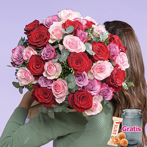 Großartiger Premiumstrauß mit roten Rosen Monte Carlo, rosa Rosen Avalanche, pinke Rosen Deep Purple, Eukalyptus und Pistazie. Durchmesser ca. 40-45 cm. Frisch für Dich zusammengestellt, mit Pflegetipps, Blumennahrung und Wasser versorgt.