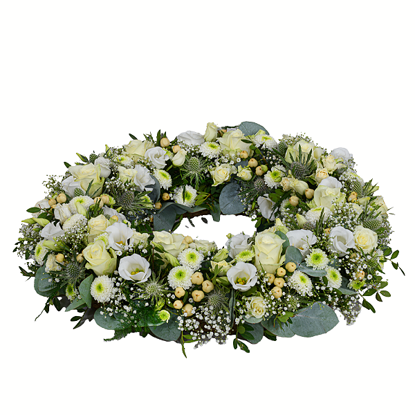 Eleganter Trauerkranz (Ø 44 cm) mit frischen Blumen: weißen Rosen, weißem Schleierkraut, weißem Lisianthus, weißen Disteln, weißen Trossrosen, weißen Santiniballs, weißem Hypericum und Blattgrün.