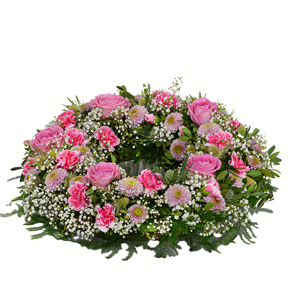 Liebevoller Trauerkranz (Ø 33 cm) mit frischen Blumen: rosafarbenen Rosen, weißem Schleierkraut, pink-weißen Spraynelken, rosafarbenen Santiniball und Blattgrün.