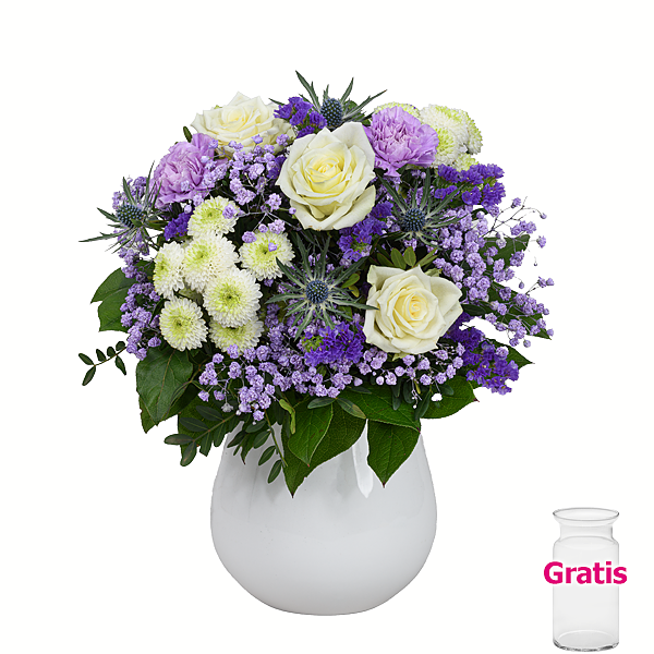 Hübscher Blumenstrauß mit weißen Rosen, fliederfarbenem Schleierkraut, blauen Statice, weißen Santiniballs, fliederfarbenen Nelken, blauen Distel und Schnittgrün. Durchmesser ca. 30 cm. Dazu erhältst Du einen Beutel Blumennahrung und eine Pflegeanleitung.