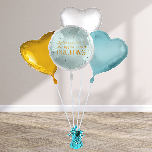 Inhalt: 1x Folienballon „Herzlichen Glückwunsch zur bestandenen Prüfung“, 1x Herzballon Hellblau, 1x Herzballon Weiß, 1x Herzballon Gold (jeweils Helium-gefüllt)