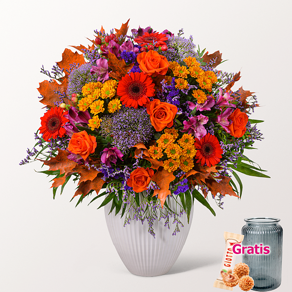 Großartiger Premiumstrauß mit orangen Rosen, roten Germini, blauen Trachelium, pinken Alstromerie, fliederfarbenen Limonium, orangen Santini, roten Hypericum, blauen Statice, orangem Eichenlaub, Chico Jumbo und Pistochia. Durchmesser ca. 45 cm. Frisch für Dich zusammengestellt, mit Pflegetipps, Blumennahrung und Wasser versorgt.