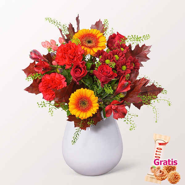 Blumenmix zum selber arrangieren: rote Rosen, orange-rote Germini, oranges Hypericum, rote Alstromerie, rote Santini, rote Nelken, rotes Eichenlaub und Thlaspi. Mit Pflegetipps, Blumennahrung und mit Wasser versorgt.